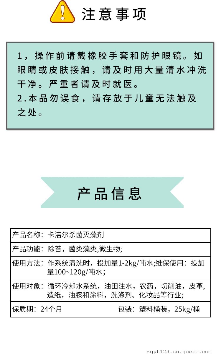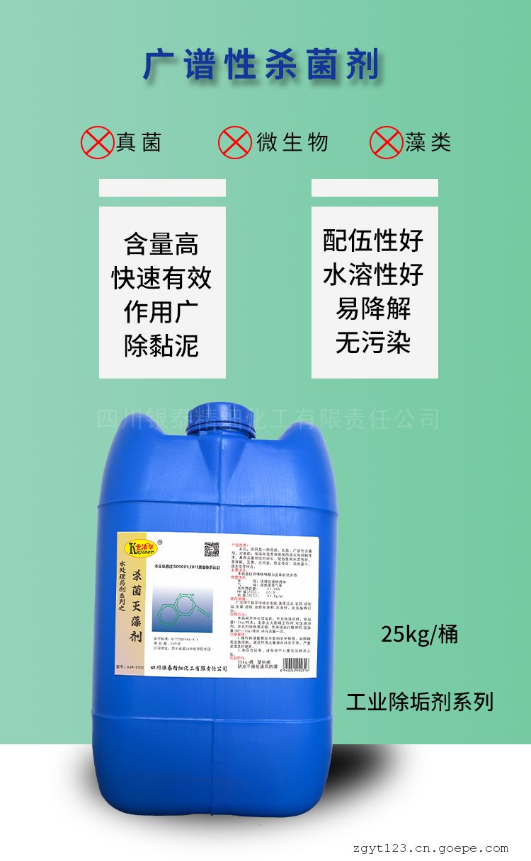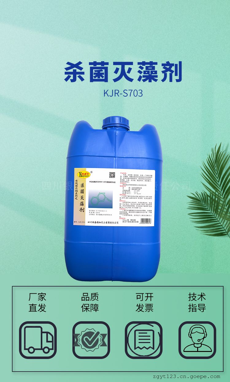 品牌:卡洁尔 型号:KJRS703 含量:90 % 外观:黄绿色或橙黄色透明液体 有效物质含量:50 % PH值使用范围:≥3.0 CAS:KJRS703 杀菌灭藻剂KJR—S703