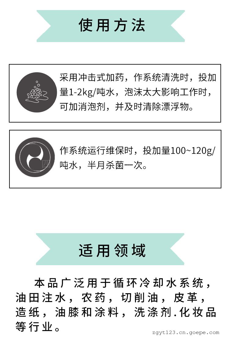 采用冲击式加药,作系统清洗时,投加量150~300g/吨水,泡沫太大影响工作时,可加消泡剂,并及时清除漂浮物。作系统运行时,投加量60~120g/吨水,半月杀菌一次。