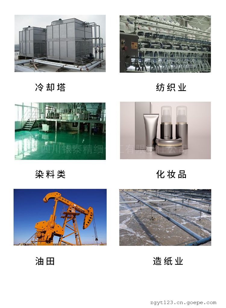 广泛用于循环冷却水系统,油田注水,农药,切削油,皮革,造纸,油膝和涂料,洗涤剂.化妆品等行业。