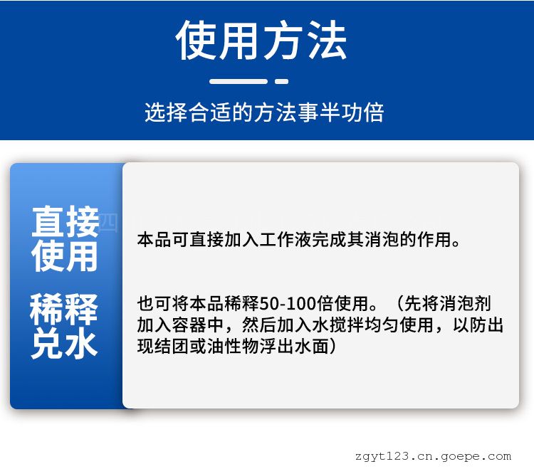 100倍使用。(先将消泡剂加入容器中,然后加入水搅拌均匀使用,以防出现结团域油性物浮出水面)。