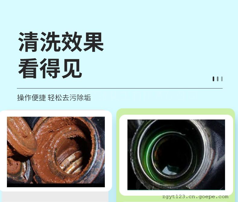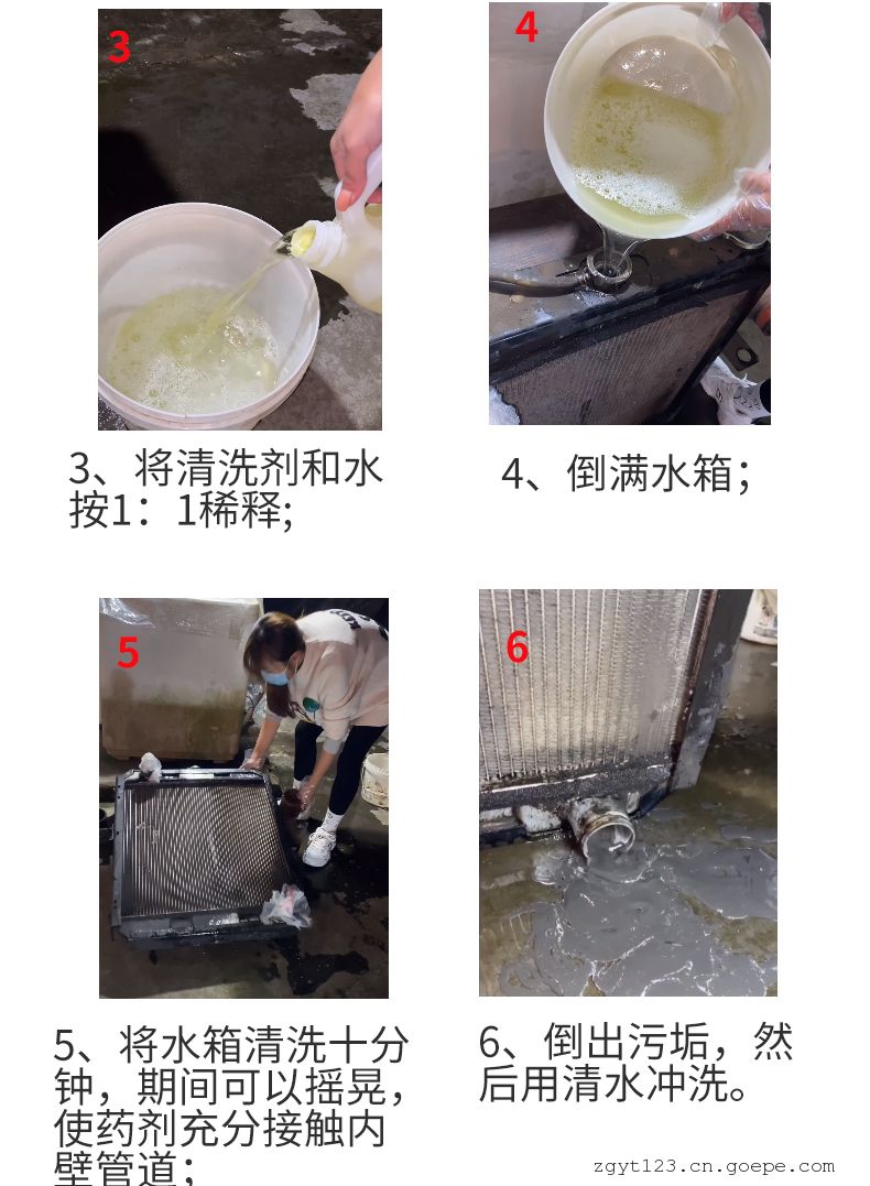 1直接喷淋到待清洗工件表面,喷洒量根据工件具体情况而定,喷洒完成,待表面乳化发泡后即可用高压水枪冲洗干净。2水箱内部和中冷器内部清洗,将水箱进水口和出水口分别注入本品,然后封闭进出水任意一个口防止流出。将水箱竖立放置2-3分钟,然后封堵另外一口子后将水箱倒置竖立2-3分钟,(如水箱进出口在一个方向可采用正反面交换放置)让药剂在水箱内分部均匀。打开进出水口放出废液,反复注入清水冲洗,直至排出液体透明。
