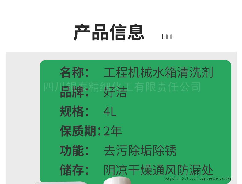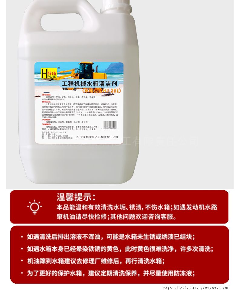 型号:HJ201 香型:无 起泡性:无 产品规格:4L 用途、使用范围:工程机械水箱清洗 包装规格:4L 品牌:好洁 适用范围: