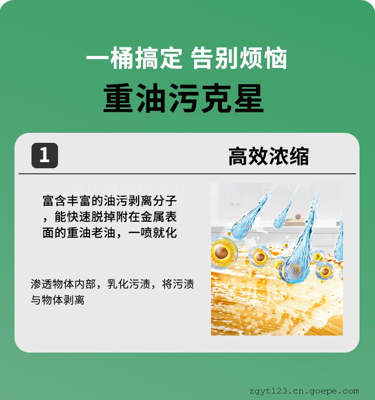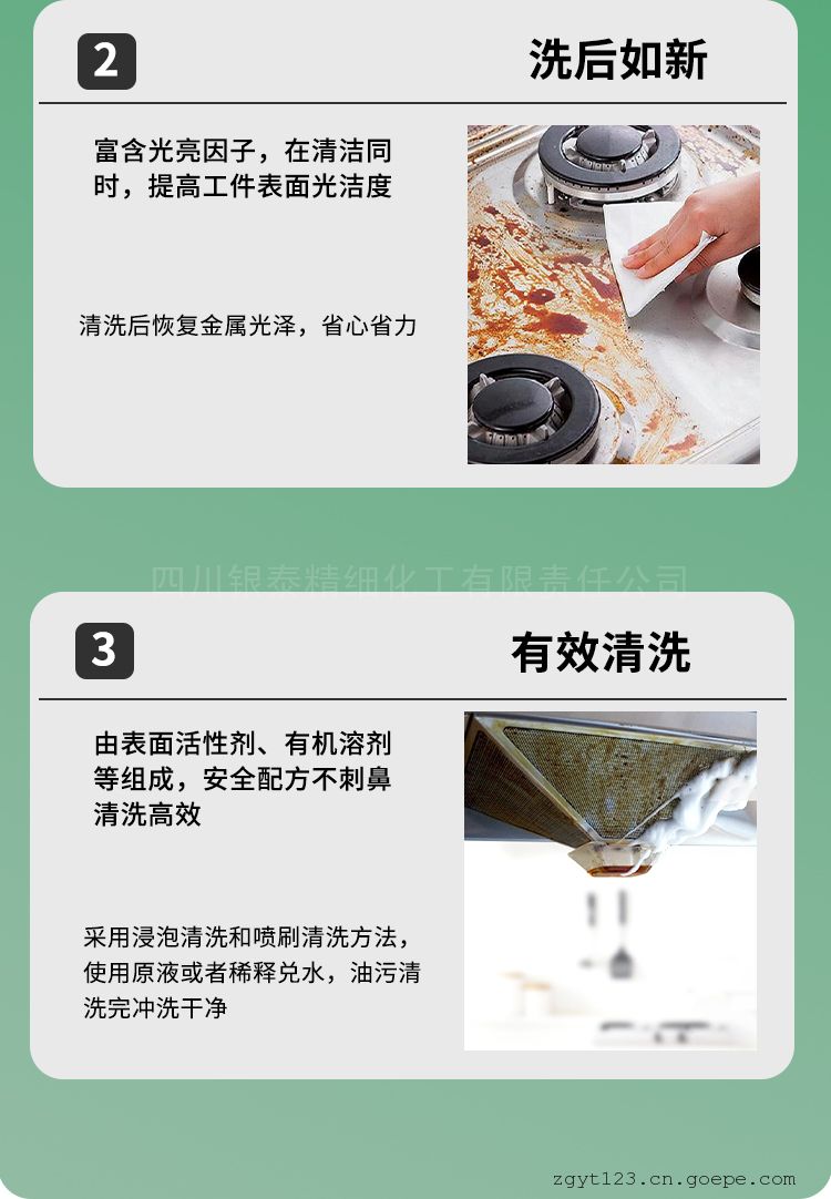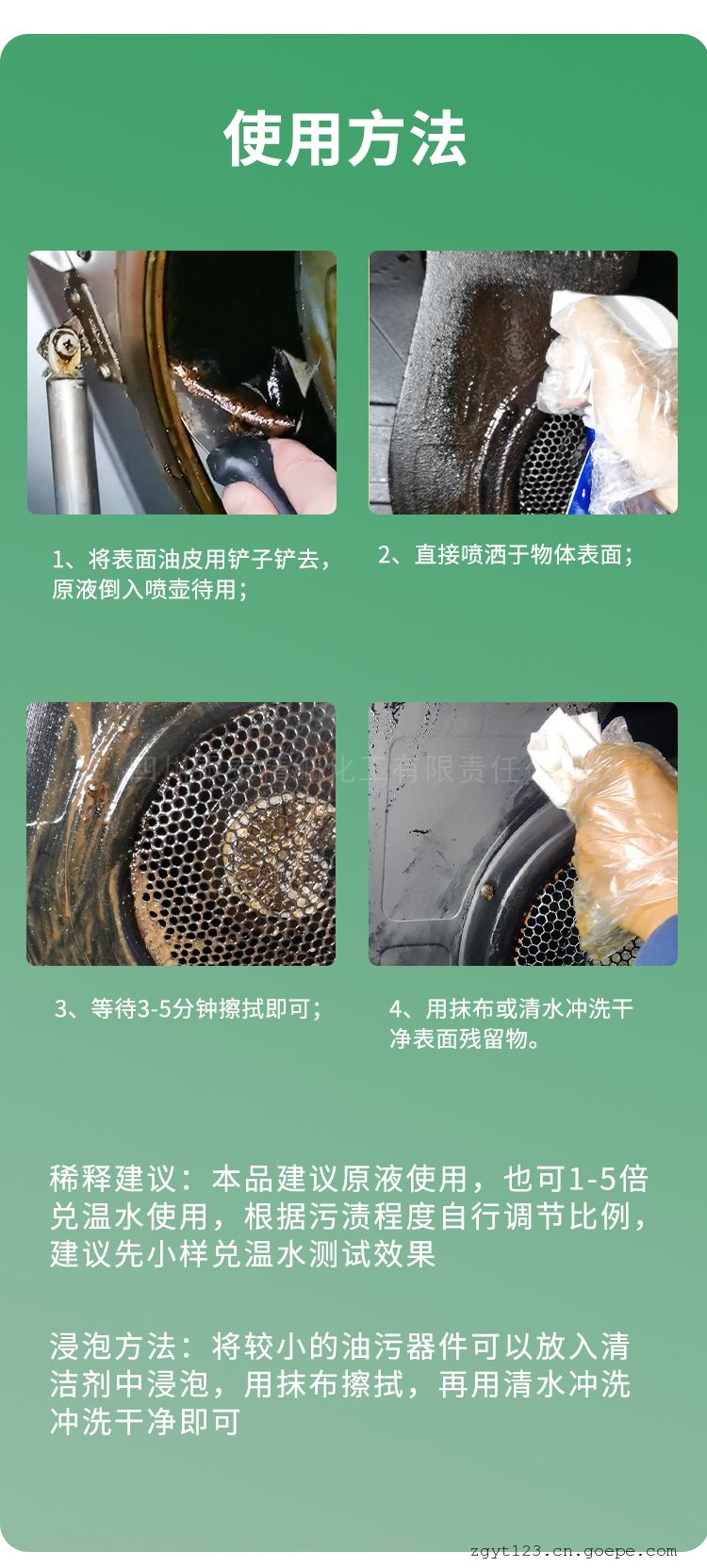 4.本品适用于各种油污,能迅速渗入厚重油污内部,使其分解成易清除的液体,自动清除顽固污垢。