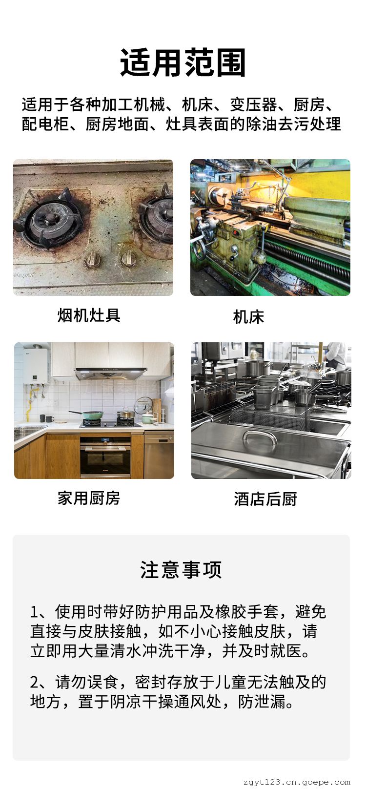 本品广泛适用于各种厨房环境的油污处理及各种工件表面油污清洁,具有快速渗透,高效分解油污能力,轻松化油如水,起到强效清洁作用。