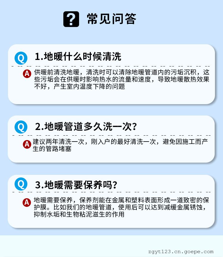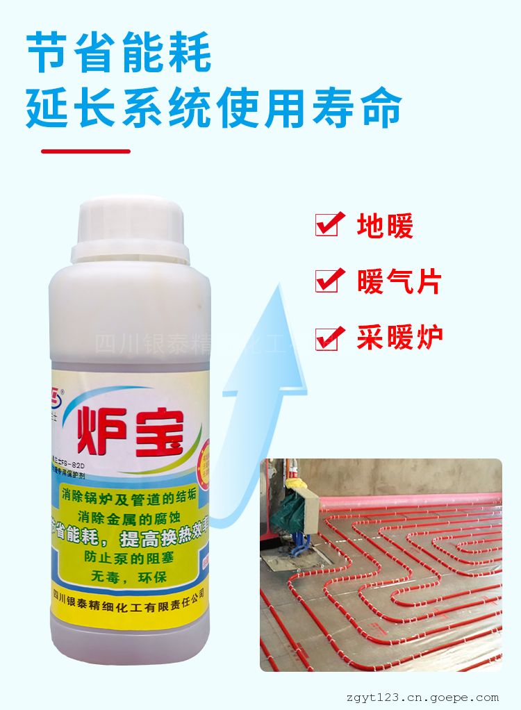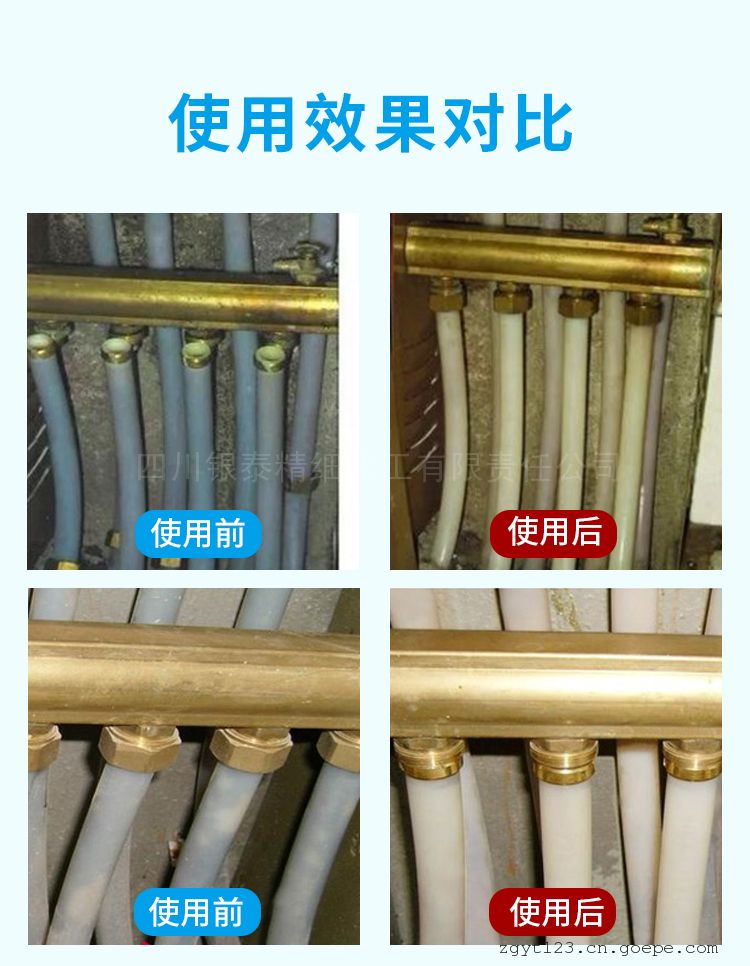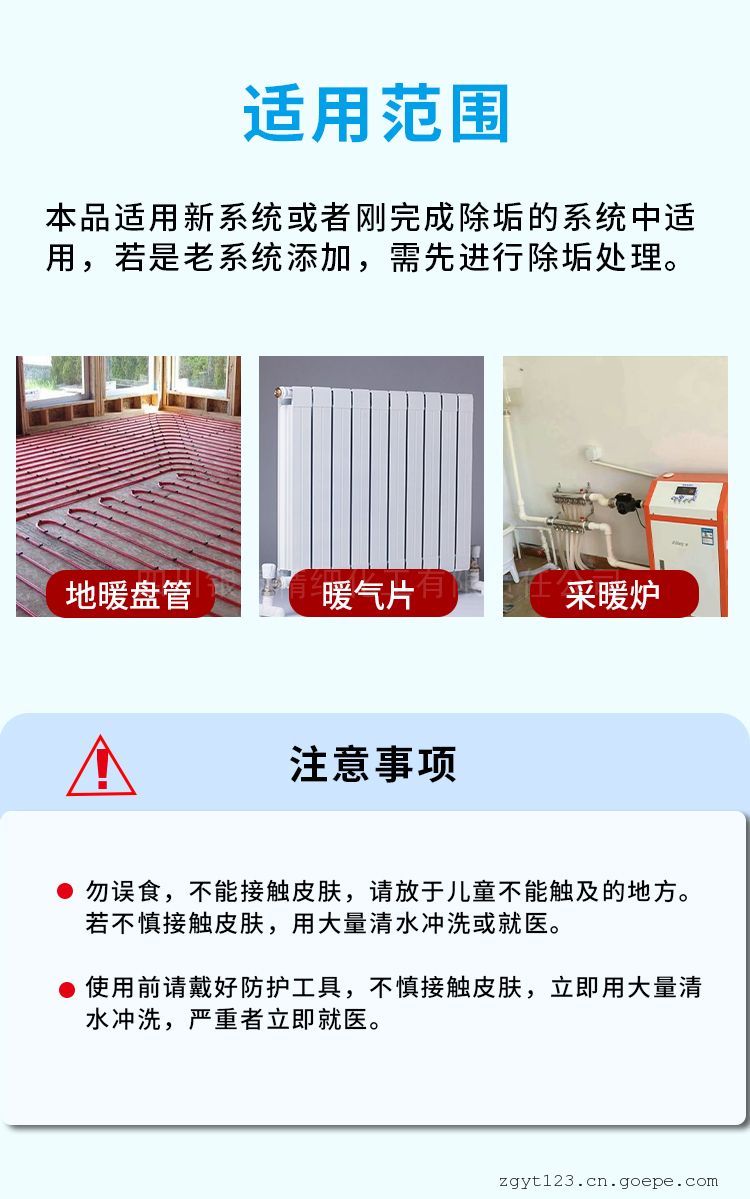 具有阻止结垢、防止腐蚀特效。长期使用可提高地暖的采暖率,节省能耗,延长系统寿命,是地暖设备必备的保护剂。