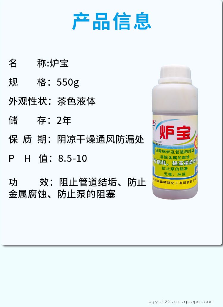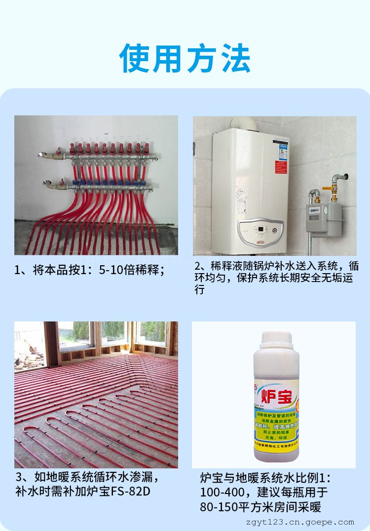 将本品1:10~30倍稀释,随锅炉补水送入系统,循环均匀,保护系统长期安全无垢运行。如地暖系统循环水渗漏,补水时需补加炉宝FS-82D。每瓶500克,适用100-500公斤循环水系统。