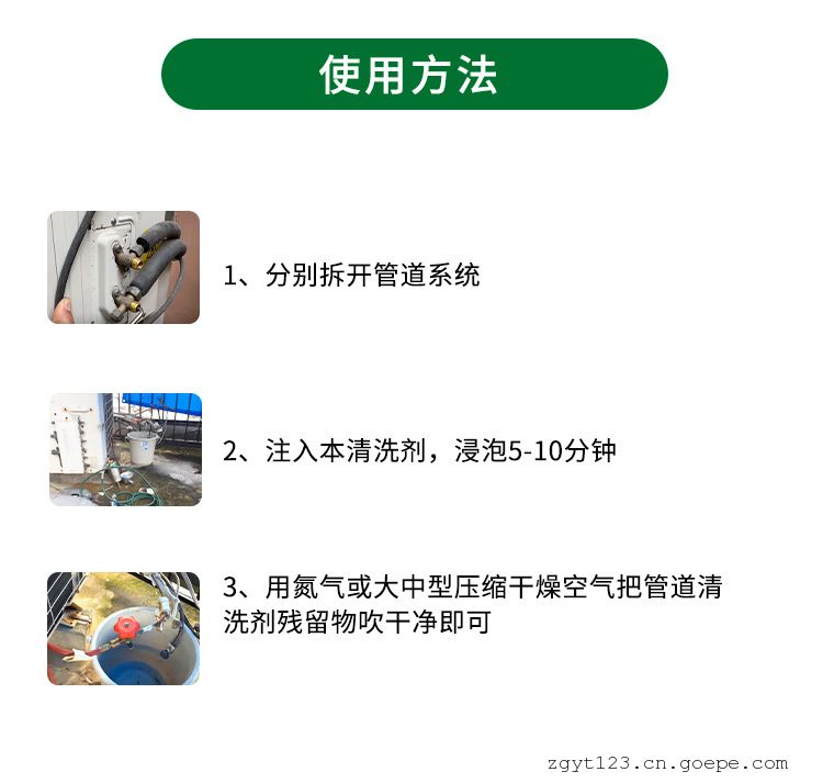 分段拆开管道系统,注入本清洗剂摇动,5-10分钟后,用氮气或大中型压缩干燥空气把管道吹净即可。