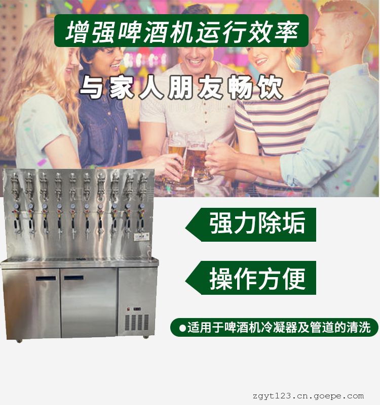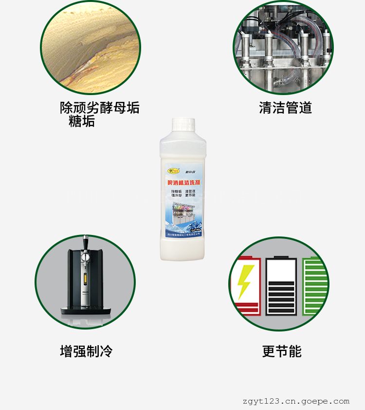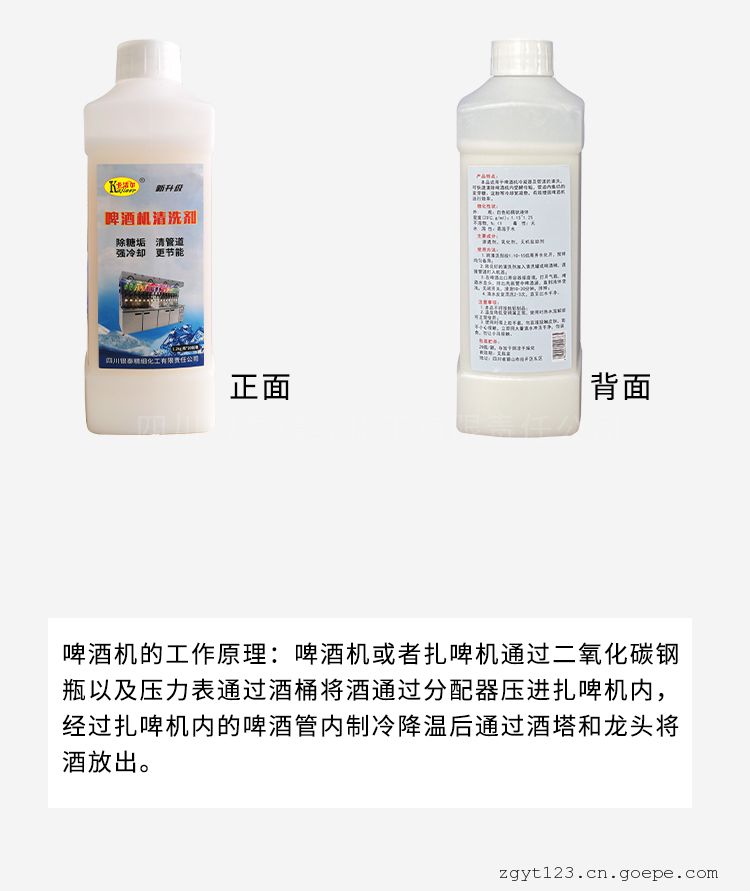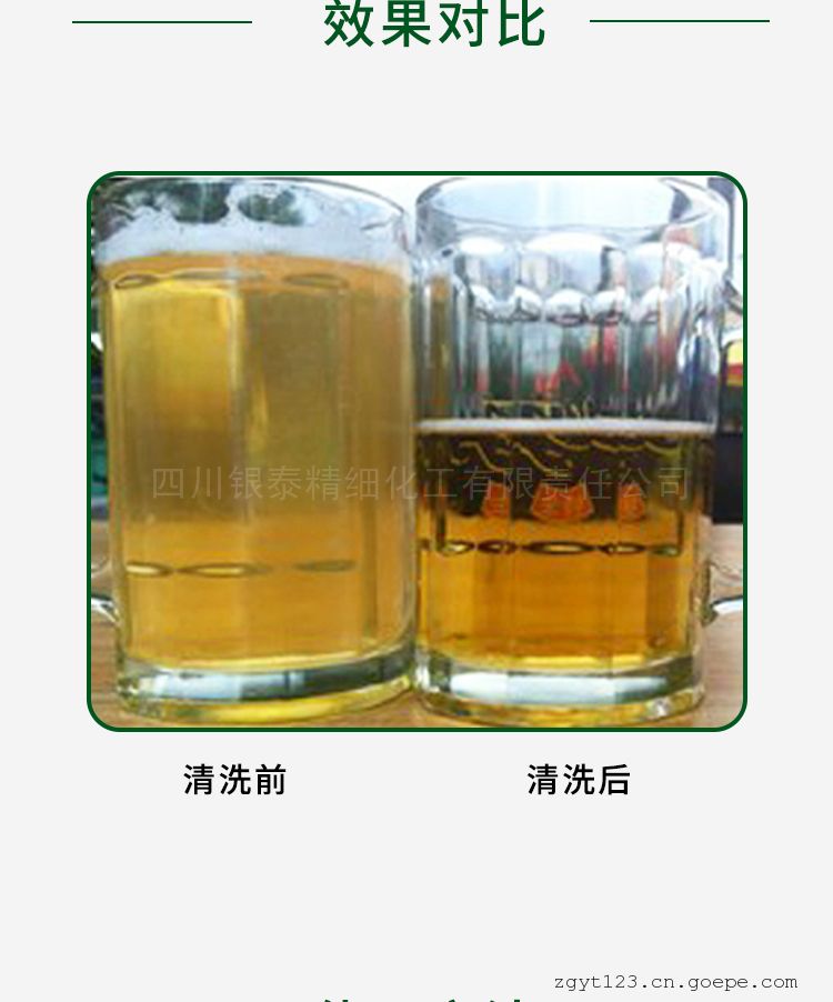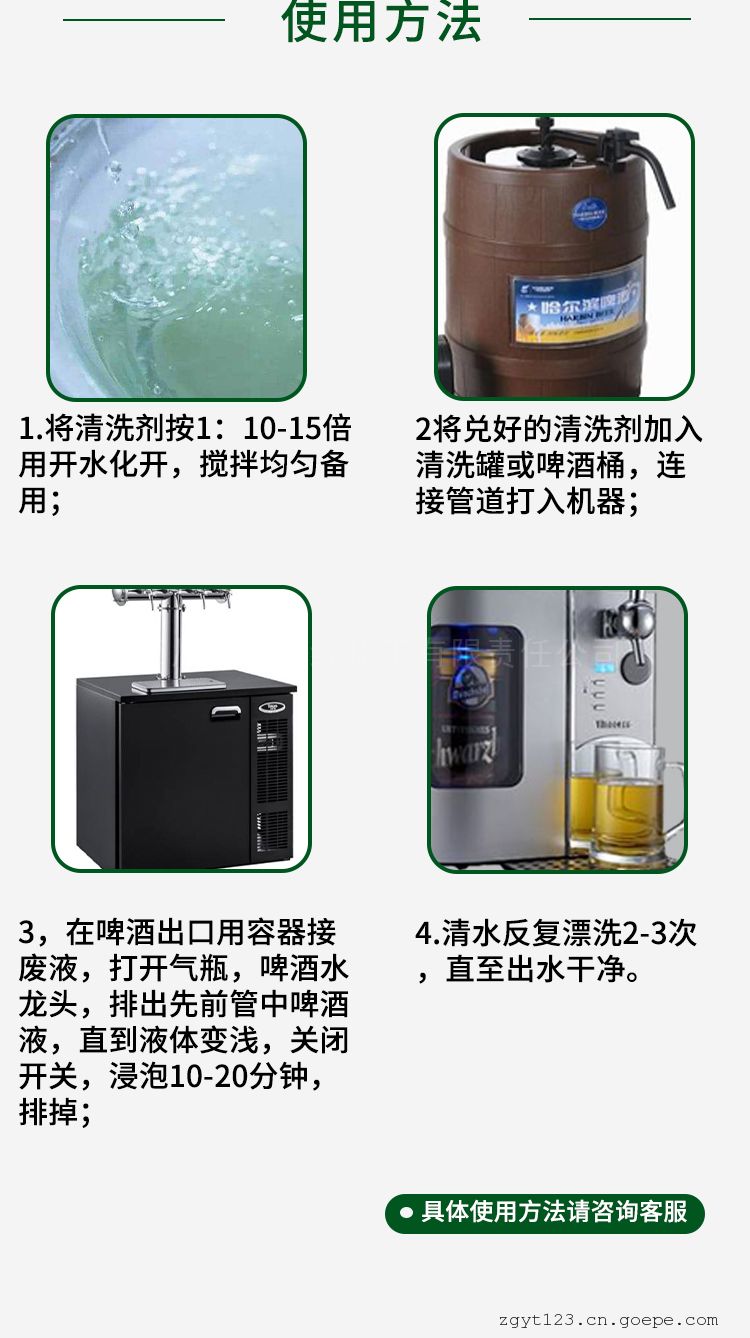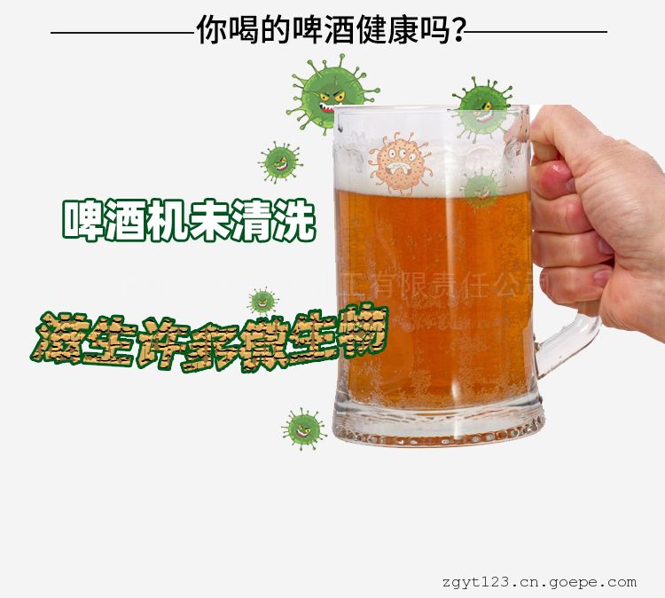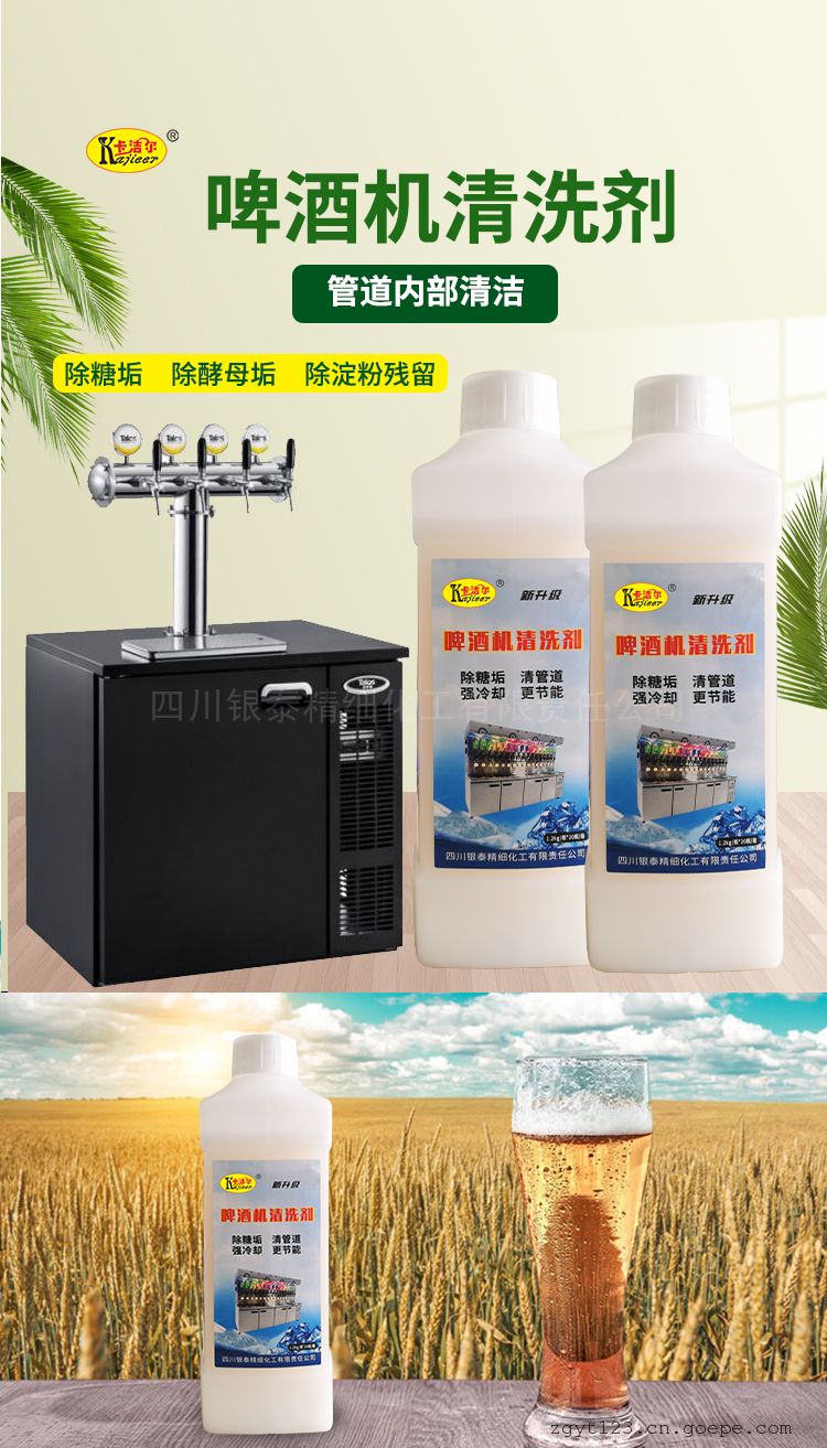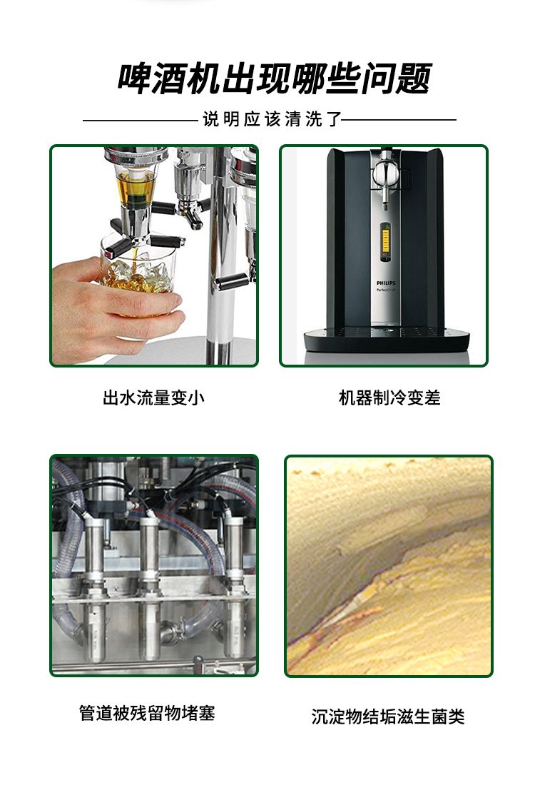 适用于啤酒机主机及管道的清洗,可快速.彻底清除啤酒机内壁酵母垢,对金色葡萄球菌及大肠杆菌的杀灭效果均达99.99%。清洗啤酒机冷凝器管道,管道内集结的麦芽糖.淀粉等冷却絮凝物。清洗后啤酒冷却效果好,冷却后的啤酒口感和性状更好。