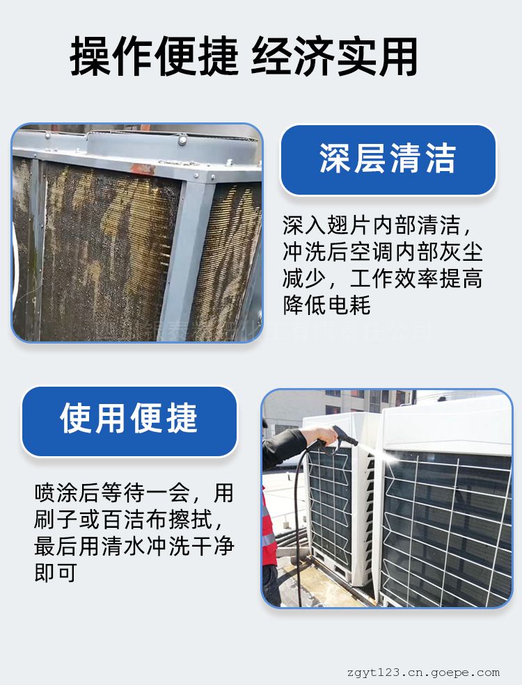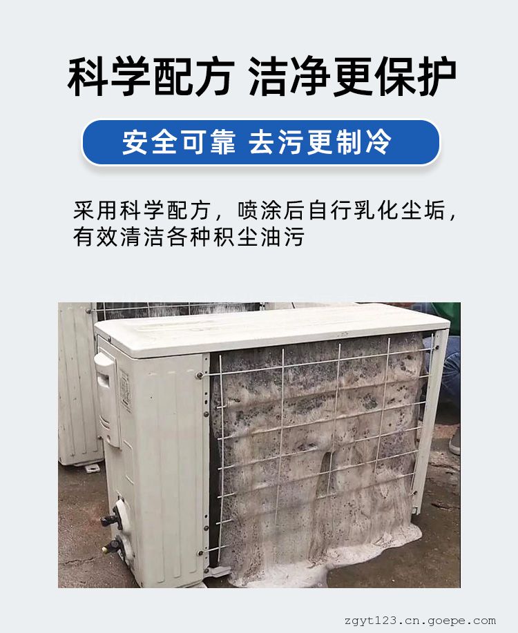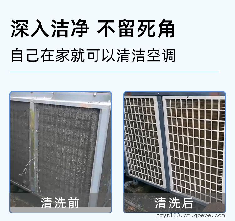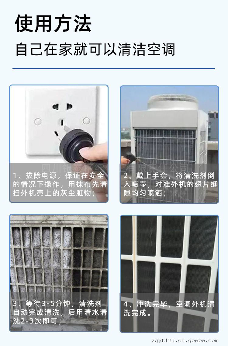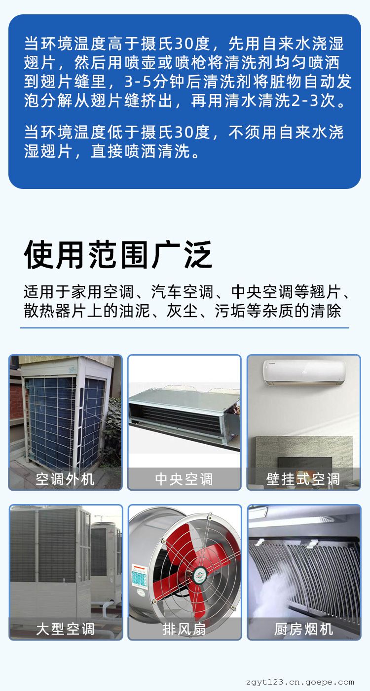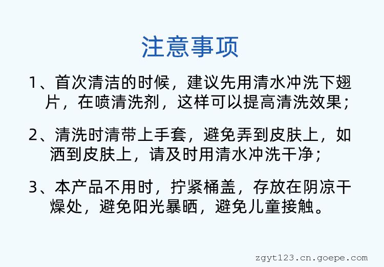 当环境温度30℃以下,直接喷洒本清洗剂至湿透;当环境温度30℃以上先用自来水将翅片(或盘管)浇湿,然后再喷洒本清洗剂至足量。3-5分钟后,清洗剂自动发泡将脏物清洗从翅片缝排出。发泡完后,用自来水将残余泡沫及翅片残留清洗剂冲洗干净。